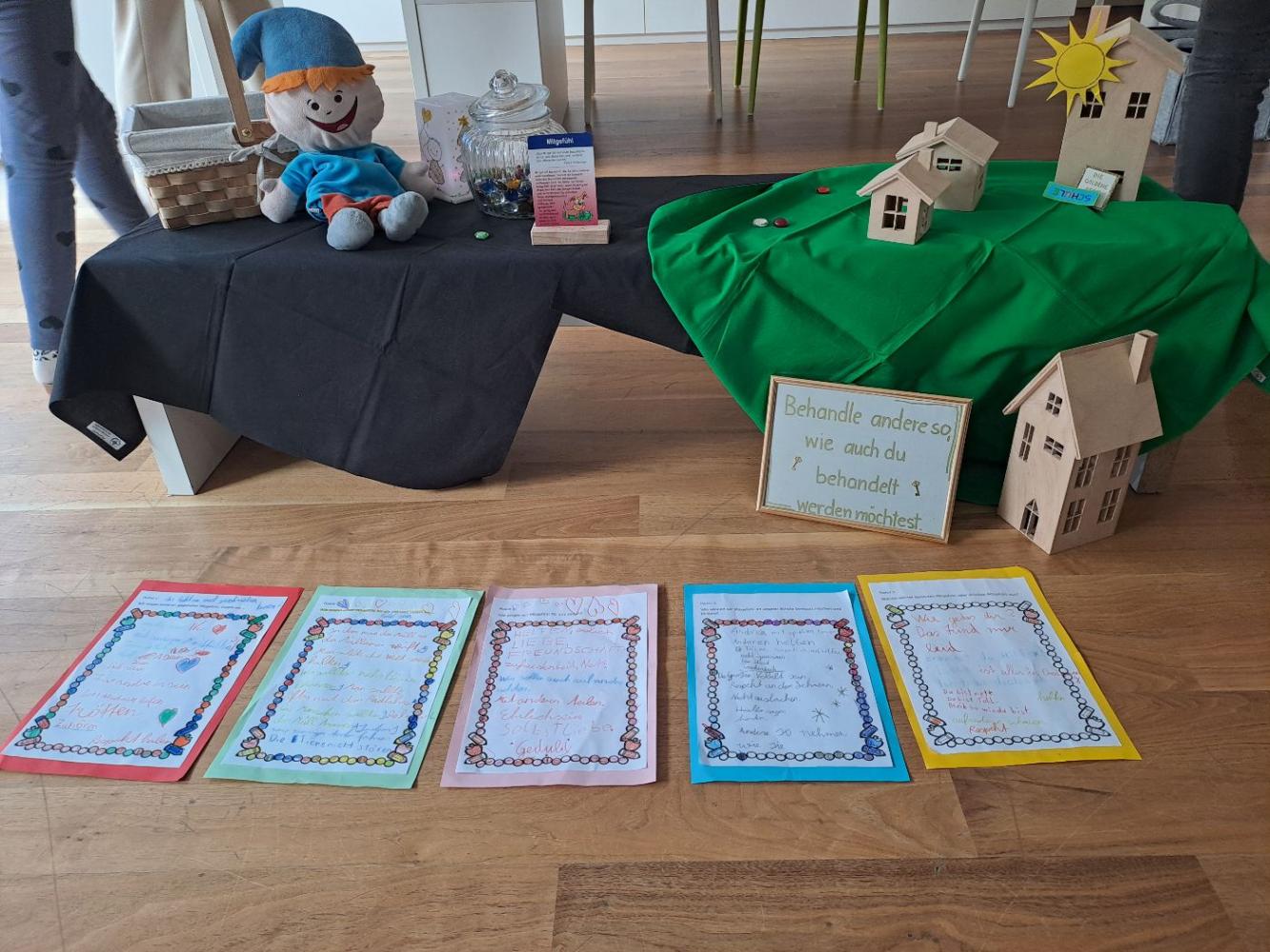 Was für eine tolle Idee: Die Kinder haben überlegt, was sie selbst glücklich macht und ihre Ergebnisse zu einer Ausstellung zusammengestellt.